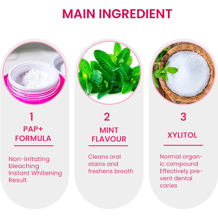 Packed with PAP, a proven peroxide-free whitening agent, along with Hydroxyapatite for enamel strengthening, Xylitol for cavity prevention, and mint for freshness. This innovative formula whitens without harsh abrasives, making it safe and gentle for everyday use.